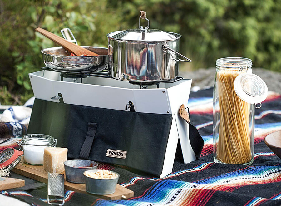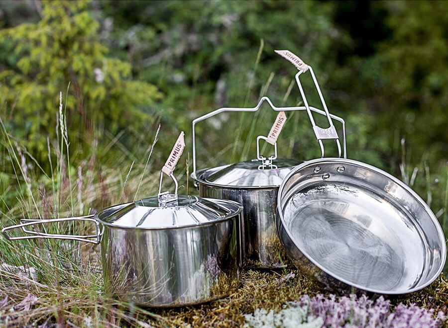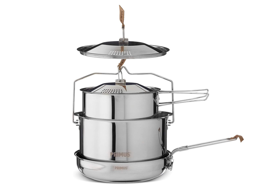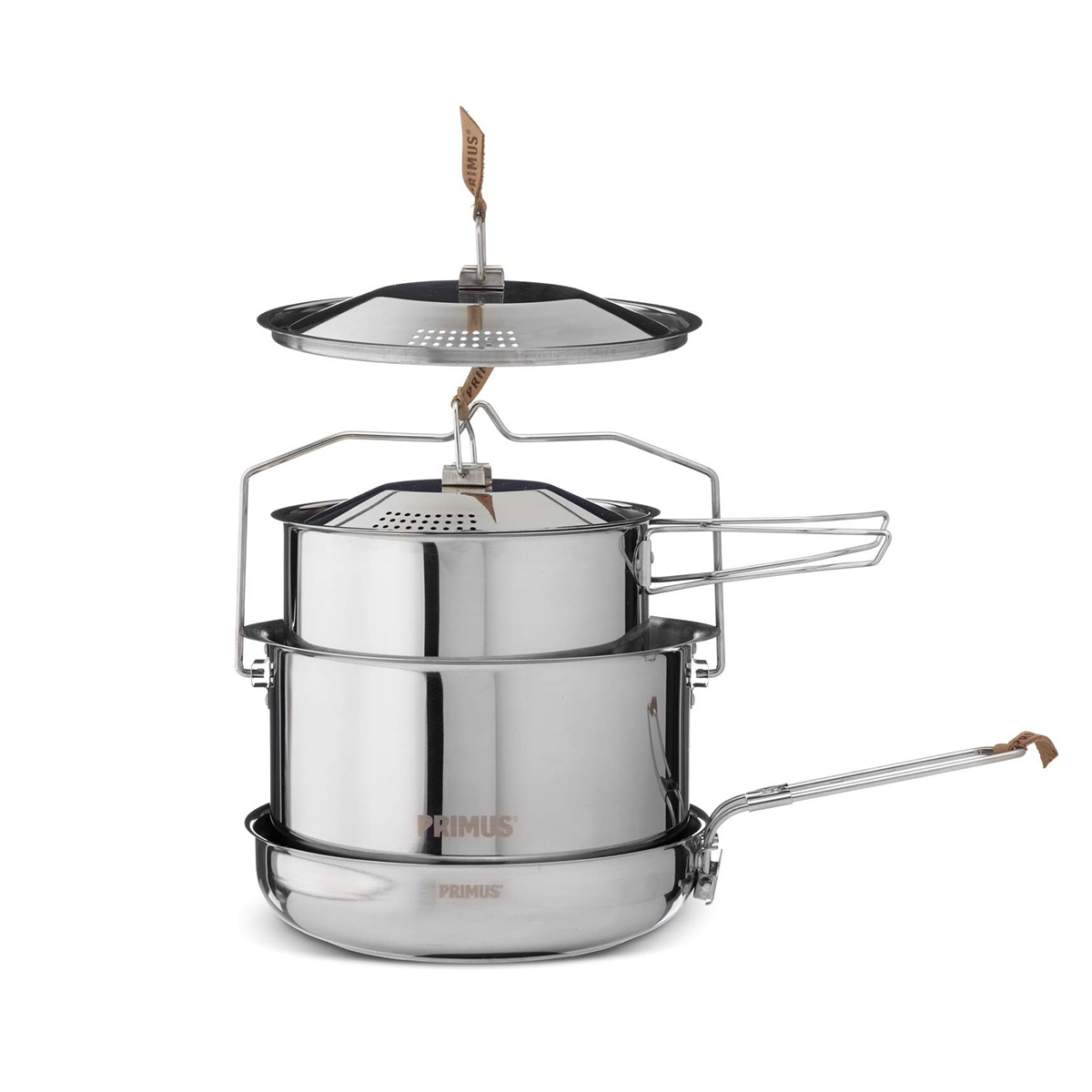 With the Primus Campfire cooking set (Large) you are equipped with a complete outdoor kitchen set. The set includes two pots with a capacity of 1.8l and 3.0l, matching lids as well as a frying pan with a 21cm diameter. All components are made of durable 18/8 stainless steel. The larger pot with a capacity of 3 liters l is ideal for placing over a campfire, thanks to its integrated folding handle. Both pot lids have a drip tray to easily remove excess liquids. The pan also has a retractable handle and is ideal for frying thanks to its aluminium base, which distributes the heat evenly. The stackable design makes it easy to store, even the smallest camping van. Everything is perfectly stowed away and well protected in the included storage bag.
