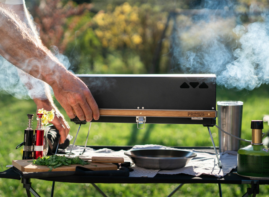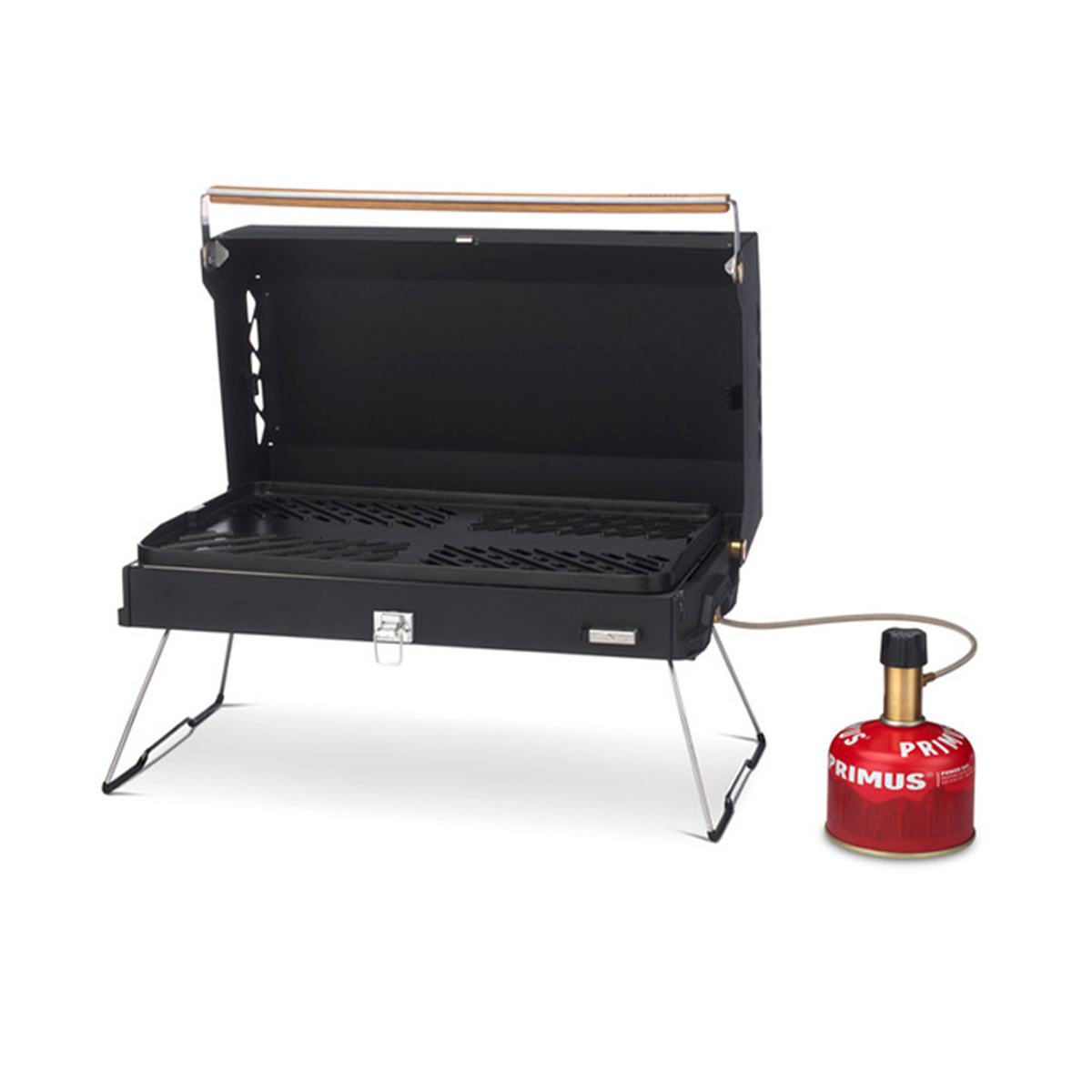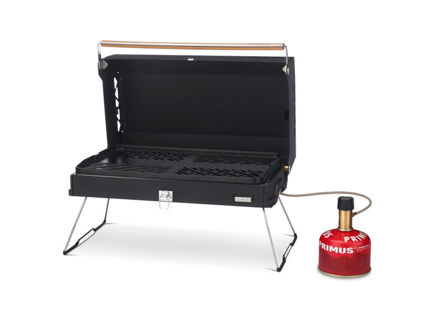 The portable Primus Kuchoma gas grill allows you to have a true BBQ experience, no matter where you are. The compact gas barbecue weighs only 4.6 kg and yet offers a large barbecuing surface for sausages, steaks, fish, or vegetables. The fold-out legs lock into place when extended to ensure a stable hold. The gas barbecue ignites conveniently at the touch of a button with the help of piezo igniters. The horizontal burner tube ensures a constant temperature and 2,500 W output. The spacious steel cover can also be used to prepare food that that needs less or indirect heat. The barbecue can be disassembled into a ceramic grill grate and a stainless-steel drip tray, that can be easily cleaned by hand or in the dishwasher. The folded gas barbecue is equipped with a locking mechanism, which makes it easy and safe to move around.