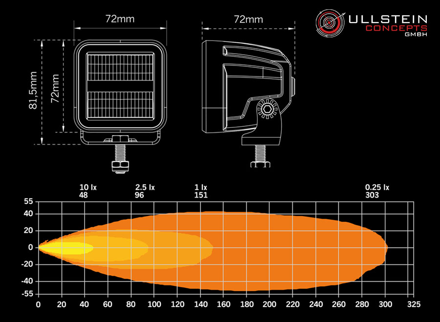 The wide beam angle achieves an illumination of 151m at 1 lux, making it ideal as a floodlight for medium distances, for example as a work light for agriculture and forestry on vehicles like tractors, haulers, or construction machinery. It is also suitable for off-road vehicles or in the logistics sector.
