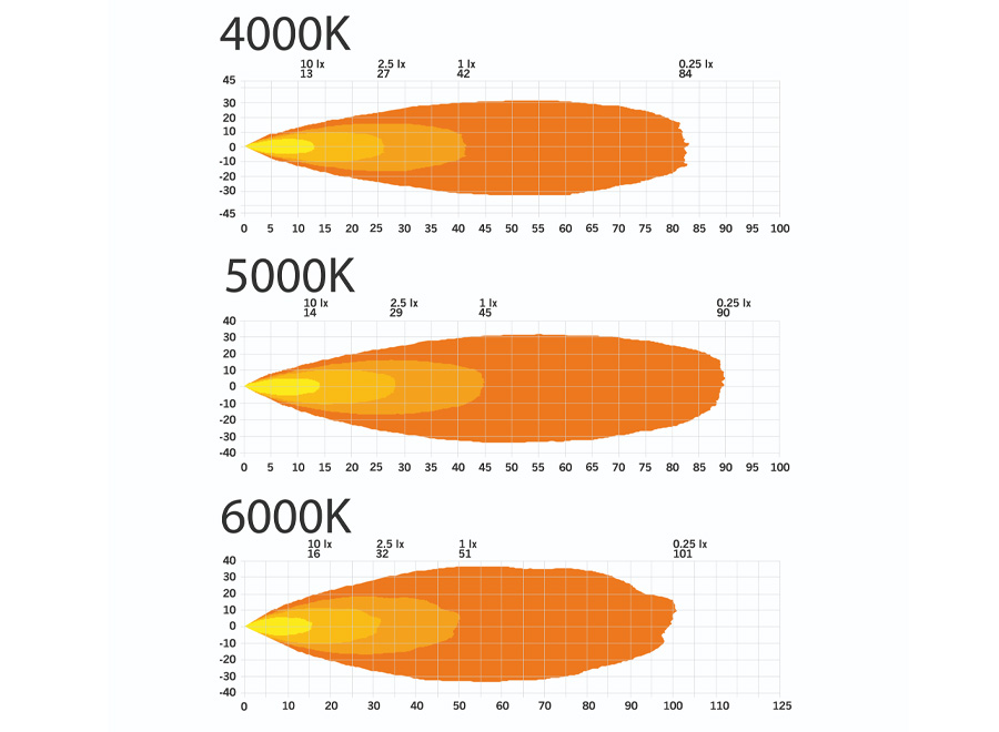 The colour temperature can be individually adjusted to your requirements. There are 3 stages in 4000, 5000 or 6000 Kelvin available. This is also ideal for changing weather conditions. 4000 Kelvin for a softer light in rainy or snowy conditions, and 6000 Kelvin for precise illumination on nights with clear visibility.