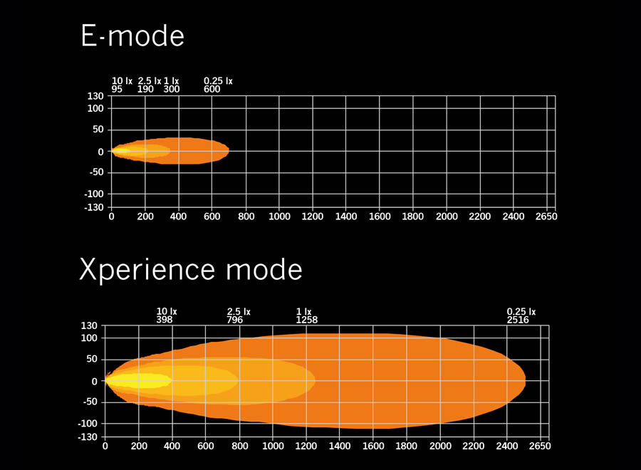 The non-throttled Xperience mode delivers the maximum available light output from the LED light bar with 30,000 active lumens, generating an impressive visibility range of 1258 metres.