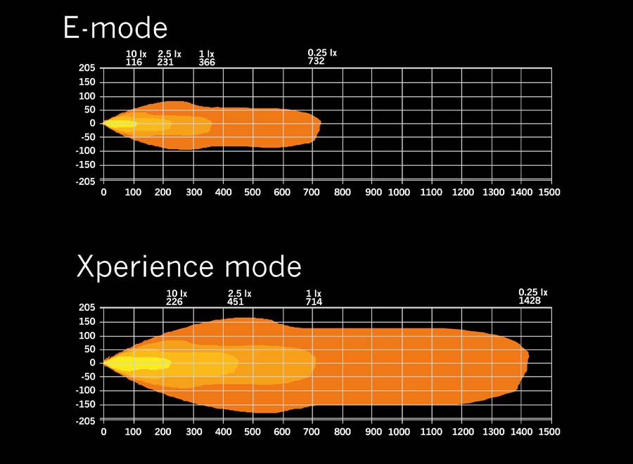 Light distance at 1lux (m): E-mode:366 Xperience:714