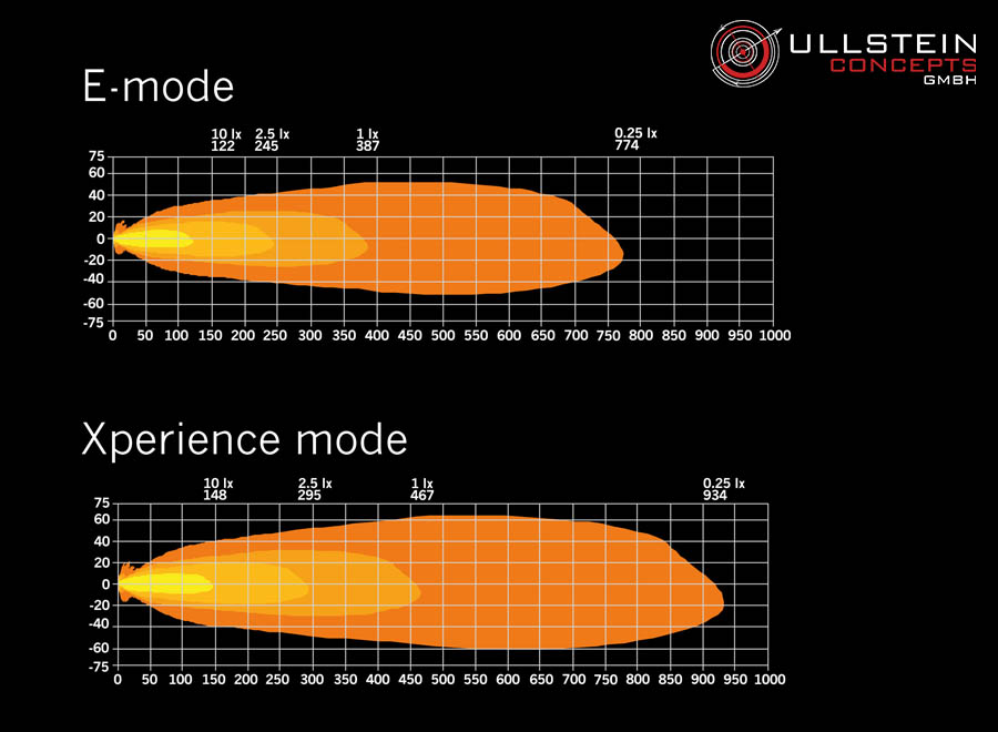 Light distance at 1lux (m): E-mode:387 Xperience:467