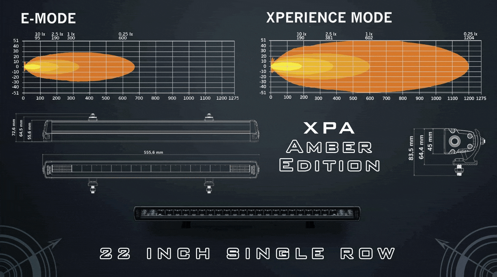 The 22-inch auxiliary driving light is a single row LED light bar with 1,875 active (measured) lumens in E mode and an impressive 7,150 active lumens in Xperience mode. This results in a 65% higher output compared to the previous model.