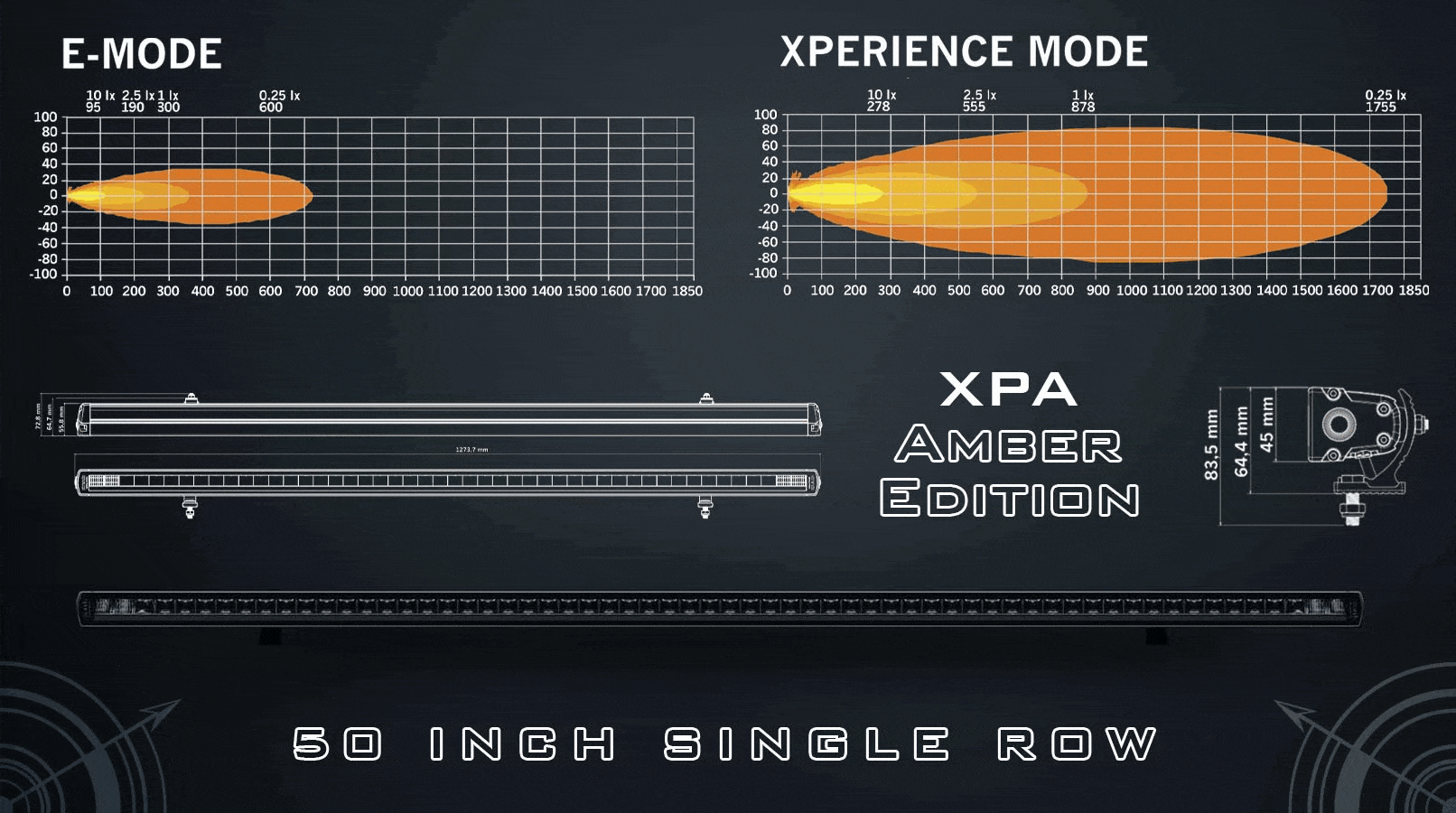 With the E-mode spotlight adapted for road conditions, the 50-inch light bar achieves a visibility range of 300 metres with 1,475 active lumens.