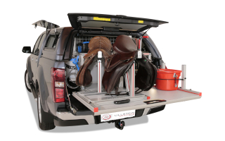 Das Schiebeplateau ist durch eine Energiekette mit zwei 12V Steckdosen bestückt um die Wasserpumpe, eine Heizdecke im Winter oder eine Kühlbox zu betreiben. So bietet der Transport Ihrer Tiere während kurzer oder langer Reisen im Pickup höchste Sicherheit und Komfort.