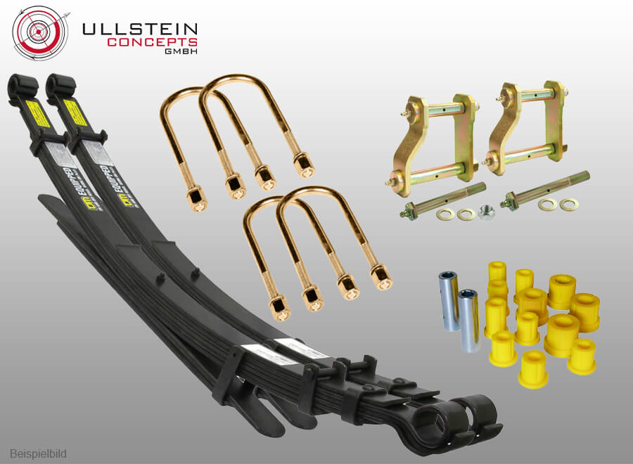 Es handelt sich um ein komplettes Set mit 2 Blattfederpaketen, U-Bügeln, abschmierbaren Schäkeln und Bolzen für die vordere und hintere Federaufhängung und Polybuchsen.